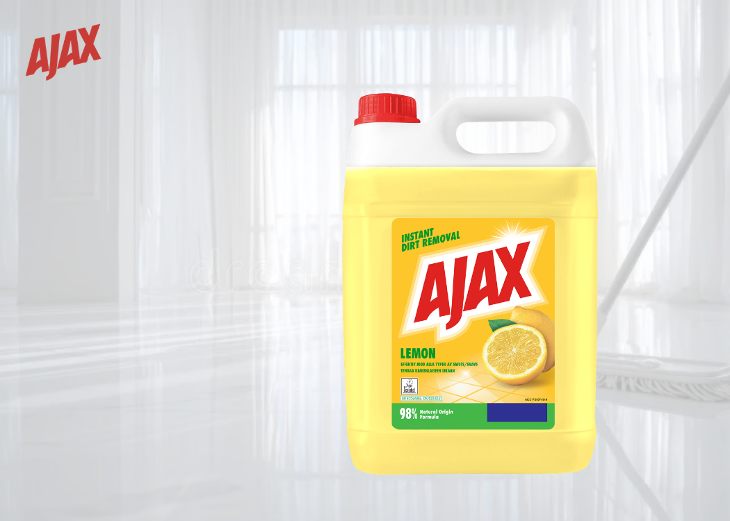 Ajax är en av Sveriges mest populära rengöringsprodukter och marknadsledande inom effektiv städning. Och tidigare har vi får Ajax Allrengöring Original 5 liter, och nu har vi även i vårt soritment Ajax Allrengöring Lemon 5 liter. Ett effektivt rengöringsmedel för alla hemmets ytor som lämnar ett skinande rent resultat, med en fräsch doft av citron!
