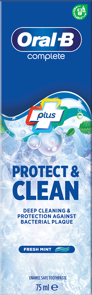 Oral-B Complete Protect & Clean tandkräm ger effektiv rengöring och skydd mot karies samtidigt som de ger en fräsch andedräkt. Flour som stärker emaljen och hjälper till att hålla tänderna rena.