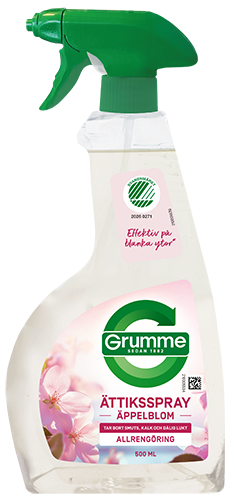 Grumme Ättikasspray äppelblom är en effektiv allrengöring som enkelt tar bort kalk, smuts och fläckar. Den är särskilt lämpad för blanka ytor och neutraliserar samtidigt dåligt lukt. Undvik att använda produkten på marmor och natursten. Och det spridningsbergränsande munstycke gör appliceringen skonsam. Grumme ättikaspray är miljömärkt med Svanen, innehåller inga animaliska ingredienser och består av biologiskt nedbrytbara ingredienser. Den är dermatologiskt testad och flaskan är av 100% återvunnen plast.