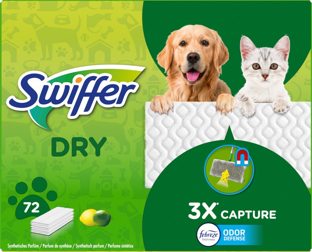 Swiffer Dry Pet refill lämnar en fräsch citrus doft efter sig och fungerar på alla torra golvytor i hemmet, rengöringsdukarna tar upp och låser in damm och hår från husdjuren.