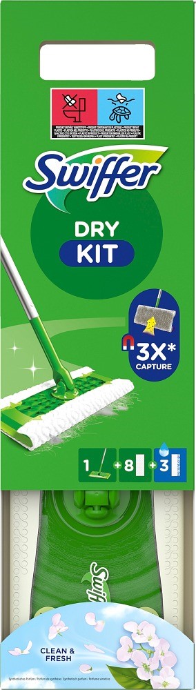 Swiffer Floor startkit gör det enkelt för dig att hålla dina golv rena. Enkel att förvara och är ett komplett städset som innehåller en städmopp, åtta torra rengöringsdukar och tre fuktiga golvdukar. Moppen har ett 360° roterande huvud som gör det lätt att komma åt under möbler och i trånga utrymmen.