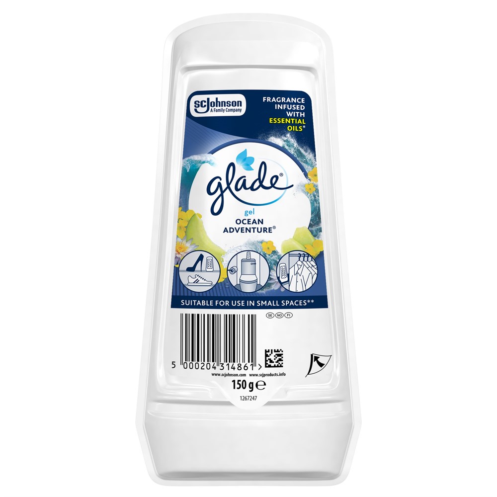 Glade Solid Ocean Adventure sprider en fräsch doft av havsbris med inslag av citrus och grönt te. Den vattenbaserade gelen tar bort dålig lukt och ger en behaglig atmosfär i upp till 45 dagar. Den praktiska förpackningen för den enkel att placera i badrum, hall, sovrum eller andra mindre utrymmen där du vill ha en jämn och långvarig doft - helt utan att behöva spraya.