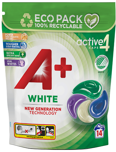 A+ White Active 4 tvättkapslar är framtagna för att hålla vita kläder riktigt fräscha. Varje kapsel har fyra separata kamrar som löser upp sig i tvätten och ger en jämn och effektiv rengöring. Formulan jobbar djupt i tyget och hjälper kläderna behålla sin ljusa och klara färg. Kapslarna är svanenmärkta. De fungerar utmärkt redan vid lägre temperatuer som 30 grader och en räcker till en normal tvätt på 4-5 kg. Serien finns för färgade kläder med.