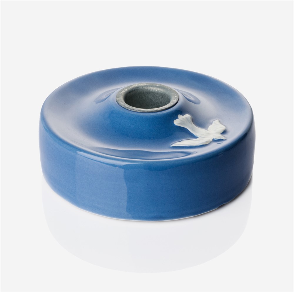 Vår populära dopljusstake i keramik, med den vita duvan. Dopljusstaken har färgen blå och passar ihop med dopljuset 1100.