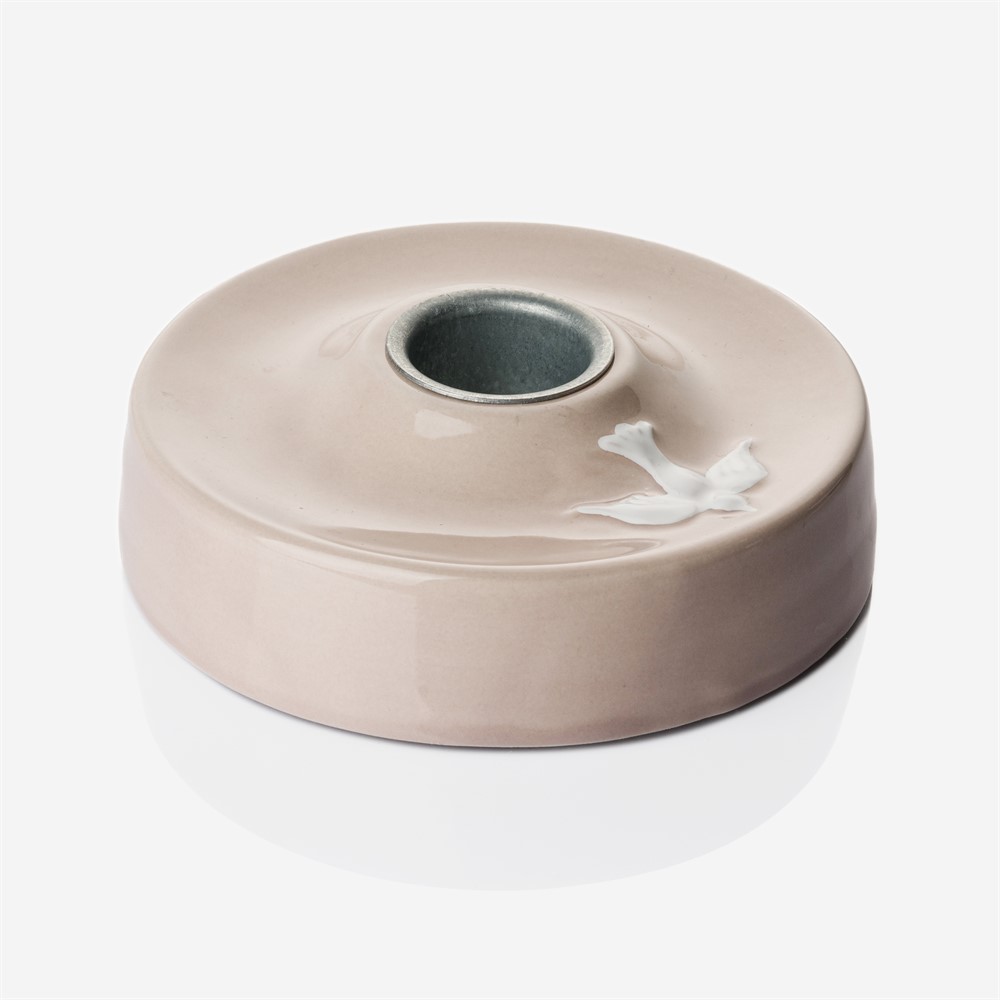 Vår populära dopljusstake i keramik med rosa glasyr och den vita duvan. Den vackra dopljusstaken passar ihop med dopljuset 2200.