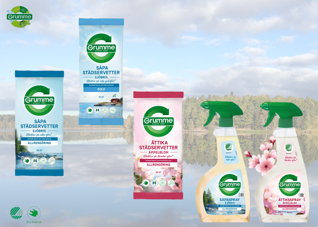 Grumme erbjuder ett brett sortiment av produkter inom rengöringsmedel, de är valda med stor omsorg av vår natur och man eftersträvar att inte använda några onödiga tillsatser. Alla produkter är miljömärkta med Svanen eller Bra Miljöval. Och nu hittar du i vårt sortiment Grumme Allrengöring som ättikaspray, såpaspray och städservetter som fungerar till de flesta ytor i ditt hem.