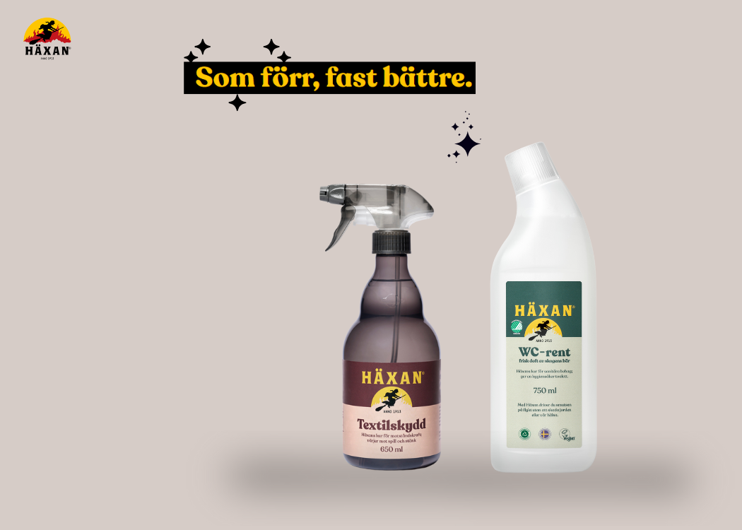 Häxans städprodukter har skapat skinande rena hem i över ett sekel och är kända för sin pålitliga kavlitet. Nu breddar vi sortimentet med två nyheter: Häxans Textilskydd, som hjälper dig att bevara och skydda dina textilier längre och är veganskt, samt Häxans WC Rent, som effektivt motverkar kalk och smuts i toaletten och är svanenmärkt.